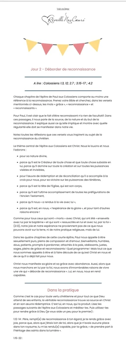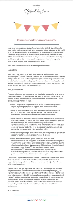 Pendant les trente jours à venir, laissez-vous guider vers une vie de gratitude, en savourant les petits comme les grands cadeaux de l’existence. En vous lançant dans cette chasse au trésor pour découvrir chaque jour une bénédiction de Dieu, vous verrez votre cœur et votre esprit se remplir d’une joie plus profonde – une joie qui rayonnera sur votre vie et celle de ceux qui vous entourent.