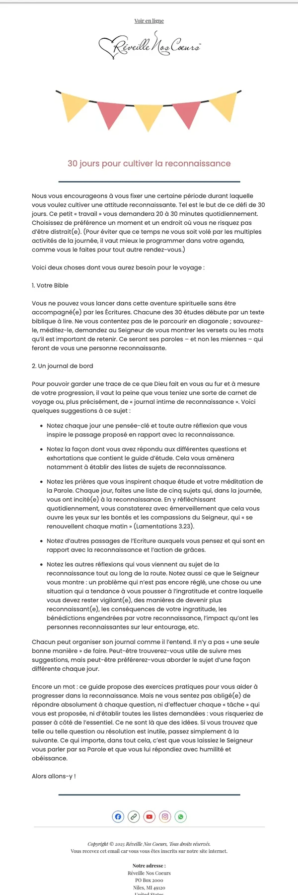 Pour préparer votre cœur avant de commencer ce parcours, prenez un moment aujourd’hui pour prier. Partagez avec le Seigneur vos sentiments actuels, vos inquiétudes, vos espoirs et vos attentes. Demandez-lui d’agir puissamment au cours des trente prochains jours.